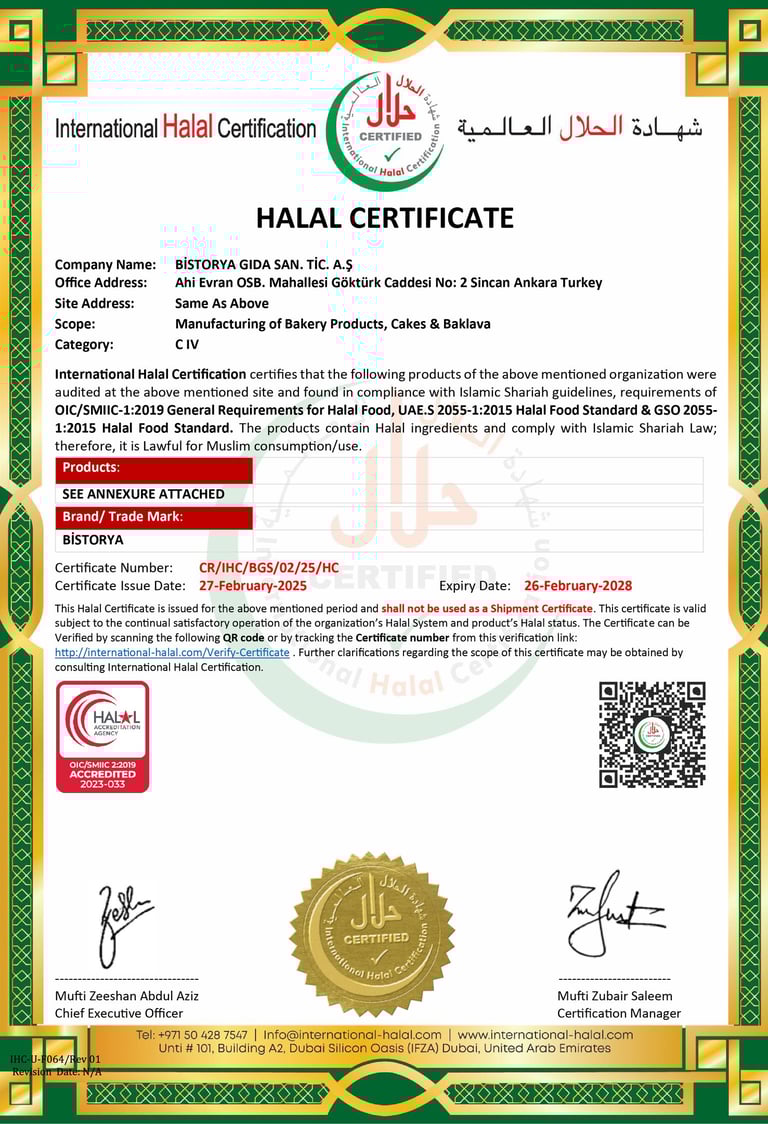 Ürünlerimizin tüm aşamalarında helal kılavuzu, gıda güvenliği yönetim sistem standardı, türk gıda kodeksi, ulusal ve uluslararası mevzuat, standart ve şartname gerekliliklerine ve helal üretim kriterlerine (ts oıc/smııc 1:2019) uygun olarak üretileceği taahhüt edilmektedir.